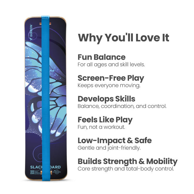 Gibbon Butterfly SlackBoard Butterfly SlackBoard on a white background Butterfly Slackboard with features listed on a white background Butterfly SlackBoard with specifications on a white background Person standing on Butterfly SlackBoard on a wooden floor Young girl sitting on a blue chair with a Butterfly SlackBoard leaning against a wall. Child holding a butterfly SlackBoard with a blurred background Child holding a Butterfly SlackBoard in a room with artwork on the wall.