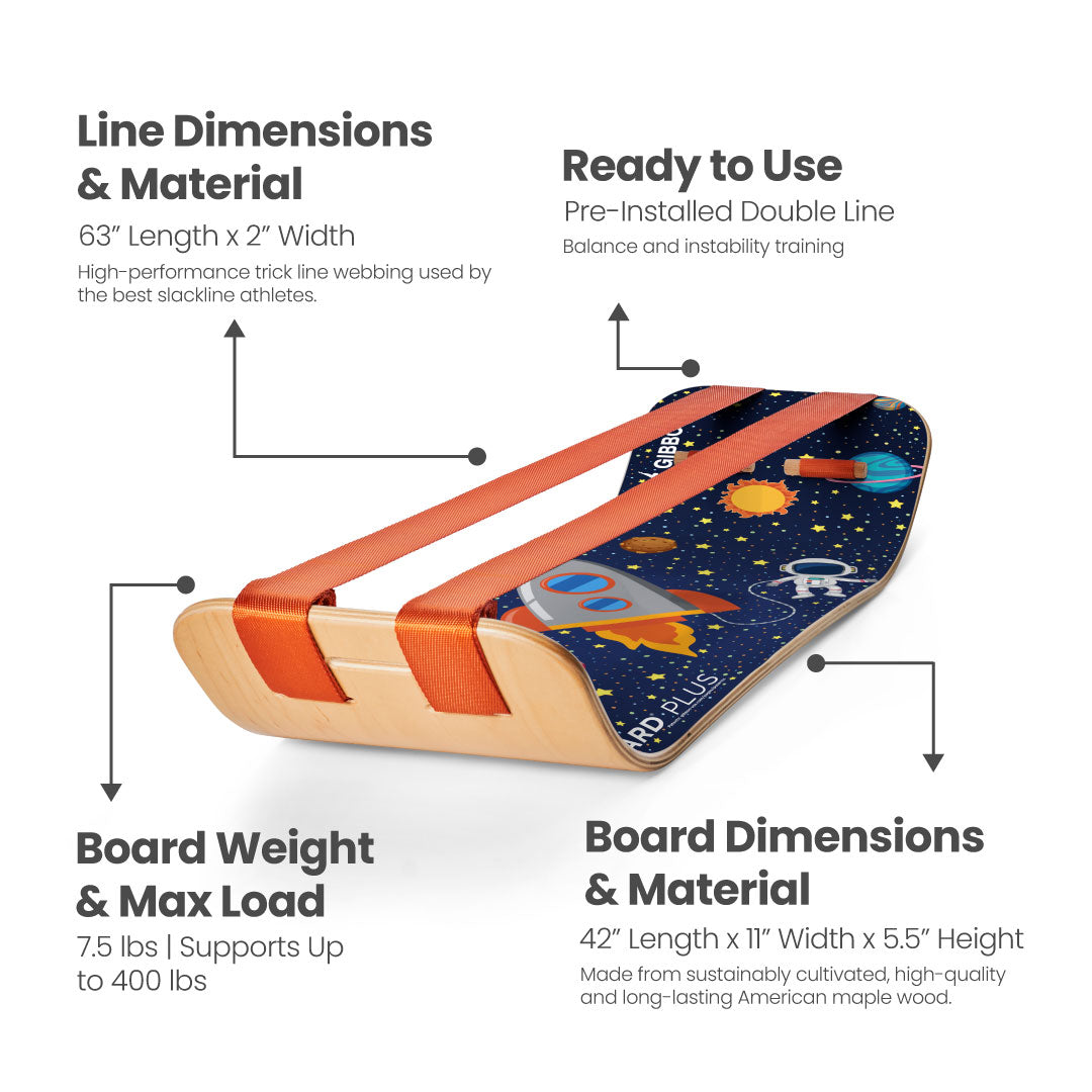 Gibbon Astro SlackBoard plus Astronaut SlackBoard with GIBBON branding on a white background Astro SlackBoard with text highlighting features on a white background Person stepping onto an astro slackboard plus on grass Child playing with an Astro slackboard plus in a living room Child using an Astro slackboard plus in a modern kitchen Child jumping off of a unicorn slackboard plus in a living room